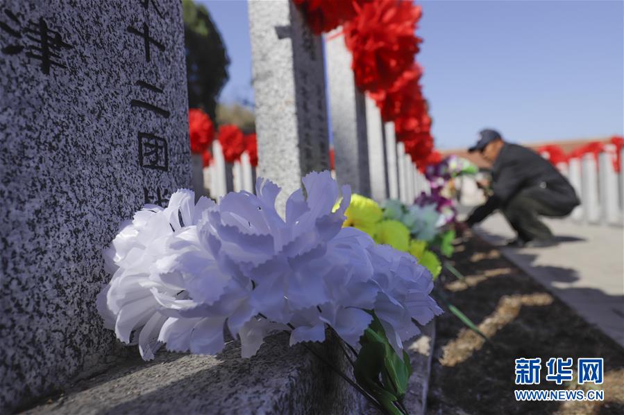 4月3日,沈阳抗美援朝烈士陵园的工作人员向烈士墓献花。新华社记者潘昱龙摄