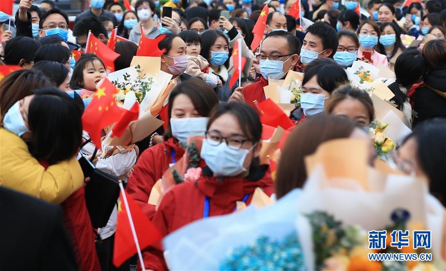 4月5日,在湖南省衡阳市南华大学附属第二医院福尔广场,人们夹道欢迎该院的17名援鄂医疗队队员回家。 当日,湖南省衡阳市61名援鄂医疗队队员在隔离休整期满后返回各自的单位。医疗队员们平安归来,受到了医院同事和家人们的热烈欢迎。 新华社发(曹正平 摄)