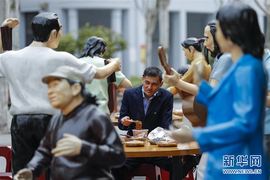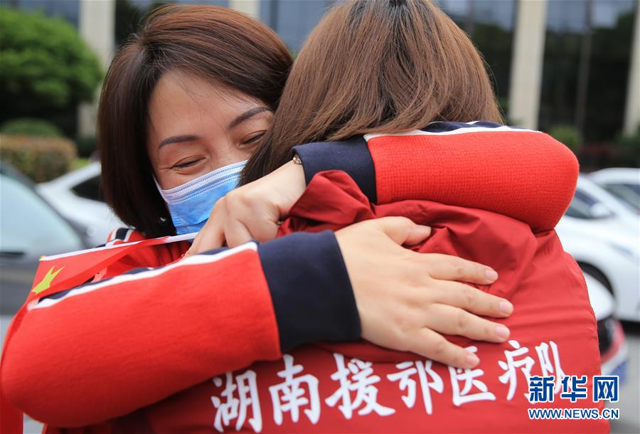 4月5日,13名患者从武汉雷神山医院康复出院,该院在院新冠肺炎患者还剩47人,其中ICU尚有20位危重症患者。当日,上海第八批援鄂医疗队所负责的武汉雷神山医院病区最后一批患者也全部康复出院,圆满完成救治任务。该队其中472名队员将于4月6日离汉返沪。图为上海第八批援鄂医疗队队员送别最后一批患者。 高翔 摄