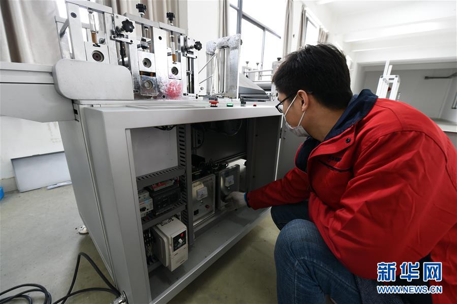 在合肥奥瑞数控科技有限公司技术研发车间,工作人员对新研制的N95口罩机进行最后的调试(3月12日摄)。新华社发(周牧 摄)
