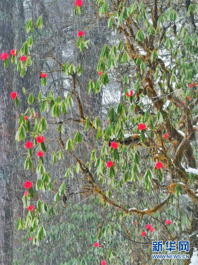 这是在派墨公路墨脱段拍摄的雪中的高山杜鹃(4月4日摄)。 近日,西藏林芝境内普降春雪。在通往墨脱的派墨公路墨脱段路边,皑皑白雪和绽放的高山杜鹃相互映衬,格外美丽。 新华社发(董志雄摄)
