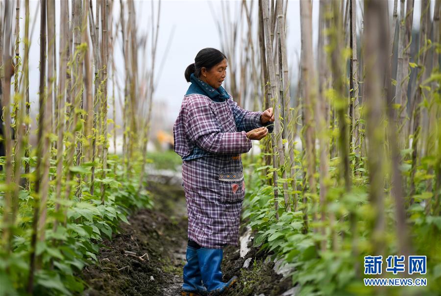 4月6日,在贵州省遵义市余庆县乌杨大坝蔬菜基地,农民在管护菜苗。 近日,各地农民抢抓农时,有序开展农业生产。 新华社发(周磊 摄)
