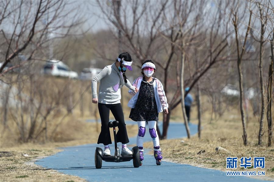 4月6日,两位小朋友在天坛公园内跳绳。 当日是清明节假期,在北京天坛公园内,一些市民游客在做好防护的前提下健身休闲,享受春光。 新华社记者鞠焕宗摄