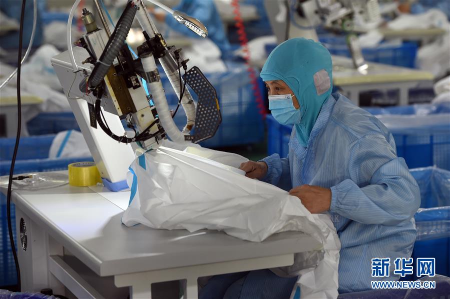 4月6日,在位于合肥庐阳经济开发区的安徽莫尼克医用材料有限公司,工人在生产医用防护服。 近日,合肥庐阳经济开发区内多家企业开足马力,生产口罩、防护服等医疗物资,助力新冠肺炎疫情防控。 新华社发(周牧 摄)