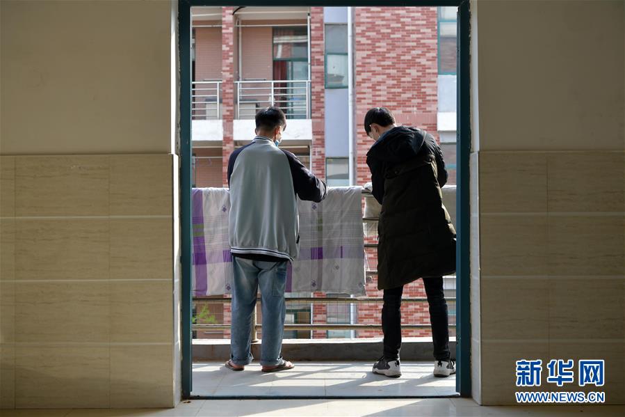 4月6日,在江西南昌湾里一中,高三学生在宿舍楼晾晒被褥。 当日,南昌市部分中学的高三和初三年级的住校学生陆续返校。4月7日,江西高三、初三学生将复学复课。 新华社记者 彭昭之 摄