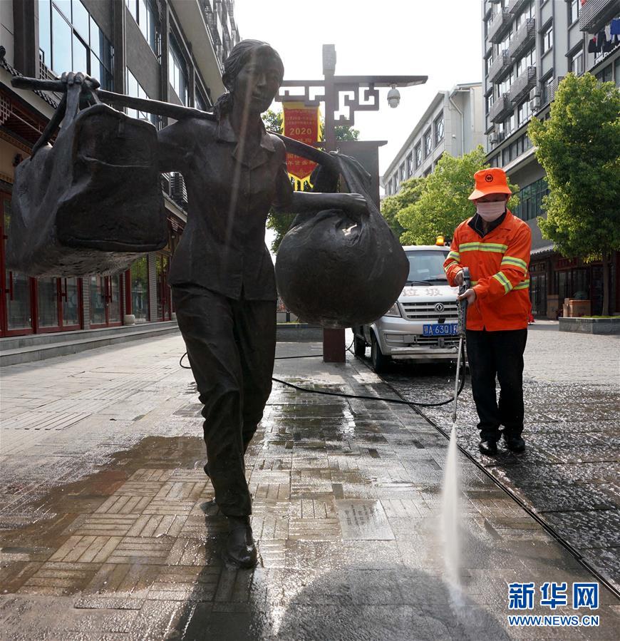 4月6日,环卫工人在武汉汉正街清洗路面。 近日,武汉汉正街市场管委会组织各方力量积极筹备复工复产。 新华社记者 王毓国 摄