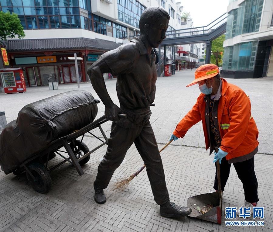 4月6日,环卫工人在武汉汉正街清扫路面。 近日,武汉汉正街市场管委会组织各方力量积极筹备复工复产。 新华社记者 王毓国 摄