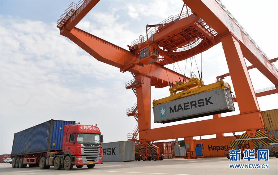 4月6日,在江西省南昌县向塘铁路口岸,一辆货车装载集装箱后准备出发。新华社记者 彭昭之 摄