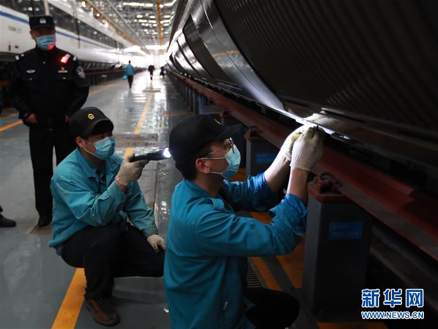 4月6日,武汉动车段两名维修人员检查维修高铁动车组。新华社发(赵军 摄)