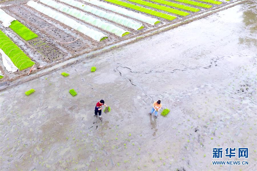 4月6日,在湖南省娄底市双峰县井字镇花桥村,农民在田间忙碌(无人机照片)。 眼下,湖南省娄底市双峰县进入插秧季,当地农民抢抓农时忙着翻耕、施肥、插秧,水田中一派繁忙景象。 新华社发(李建新 摄)