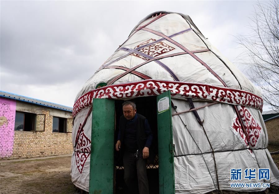 4月5日,在新疆新源县那拉提镇阿尔善村,村民海依那尔的父亲塔尔别尔地·阿吾巴克尔走出刚搭建好的毡房。新华社记者 宋彦桦 摄