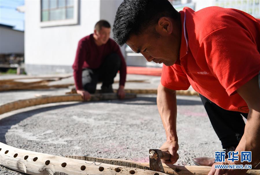 4月5日,在新疆新源县阿勒玛勒镇,民族手工艺品专业合作社的工人在制作毡房的顶圈。合作社与新疆的许多旅游景区、农家乐、旅行社等签订供货合同,产品还远销国外。新华社记者 宋彦桦 摄