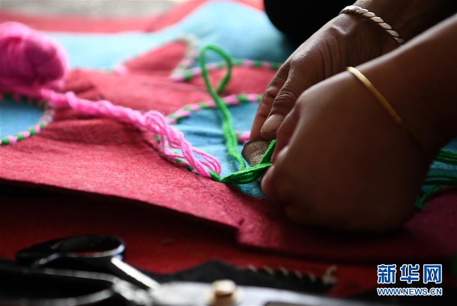 4月5日,在新疆新源县阿勒玛勒镇,民族手工艺品专业合作社的工人在缝制装饰毡房地面的花毡。新华社记者 宋彦桦 摄