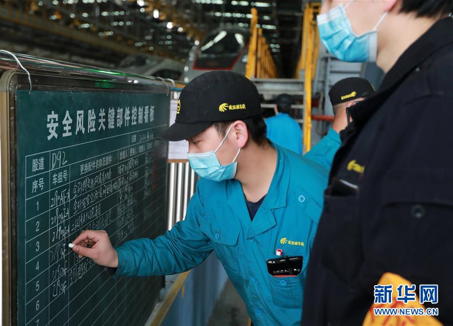 4月6日,武汉动车段工作人员对当日检修高铁动车进行汇总登记。新华社发(赵军 摄)