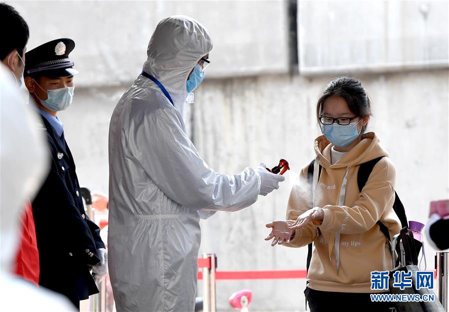 4月7日,在郑州市第九中学,工作人员对高三年级学生手部喷洒酒精消毒。当日,河南省高三年级开学复课。 新华社记者 李安 摄