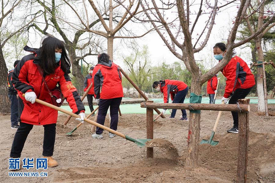 4月7日,北京市东城区社工代表在龙潭中湖公园为新种植的树木培土。 当日,北京市东城区在龙潭中湖公园开展全民义务植树活动,包括医护、社工、环卫、民警等各界代表共计150余人参加,栽植树木180余株。 新华社记者鞠焕宗摄