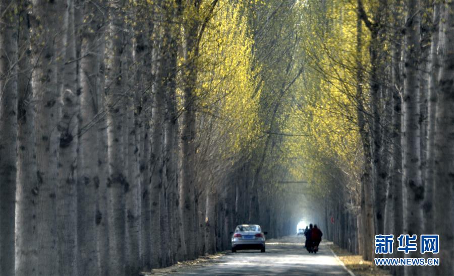 4月6日在北京市大兴区青云店镇拍摄的一条乡村林荫道路。 位于北京南部平原地区的大兴区青云店镇在大力发展平原造林的工作基础上,开展村边、沟边、路边、河边、渠边的见缝插绿和地块补植的“五边造林”工作,在小面积空余地块选种灌木、野花等植被,逐步提高植被覆盖率,既美化乡村环境也为首都大气环境改善筑好生态屏障。近年来该镇累计平原造林6100余亩,镇域林木覆盖率达到47%。 新华社记者李欣摄