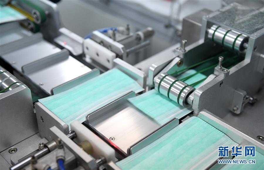 4月7日,自动生产线在生产口罩。 当日,记者探访位于广州市从化区的口罩生产商广州福泽龙卫生材料有限责任公司。据了解,为保证市场供应,该公司从1月25日开始,就全力以赴投入生产。员工数量从一开始的18人,到现在已经有200多人。产能从最初的每天10万只发展到现在的每天70万只。产品除了被当地政府收储外,也送往湖北抗疫一线,以及北京协和医院、广州市儿童医院等多家医疗机构。从3月20日开始,公司开始接受海外订单。 新华社记者 卢汉欣 摄