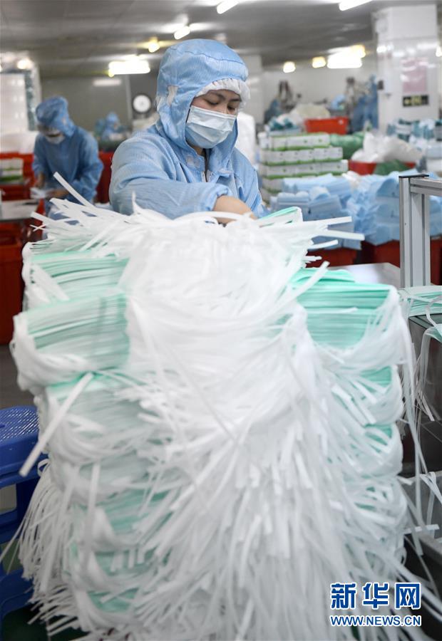 4月7日,工人在生产线上生产口罩。 当日,记者探访位于广州市从化区的口罩生产商广州福泽龙卫生材料有限责任公司。据了解,为保证市场供应,该公司从1月25日开始,就全力以赴投入生产。员工数量从一开始的18人,到现在已经有200多人。产能从最初的每天10万只发展到现在的每天70万只。产品除了被当地政府收储外,也送往湖北抗疫一线,以及北京协和医院、广州市儿童医院等多家医疗机构。从3月20日开始,公司开始接受海外订单。 新华社记者 卢汉欣 摄