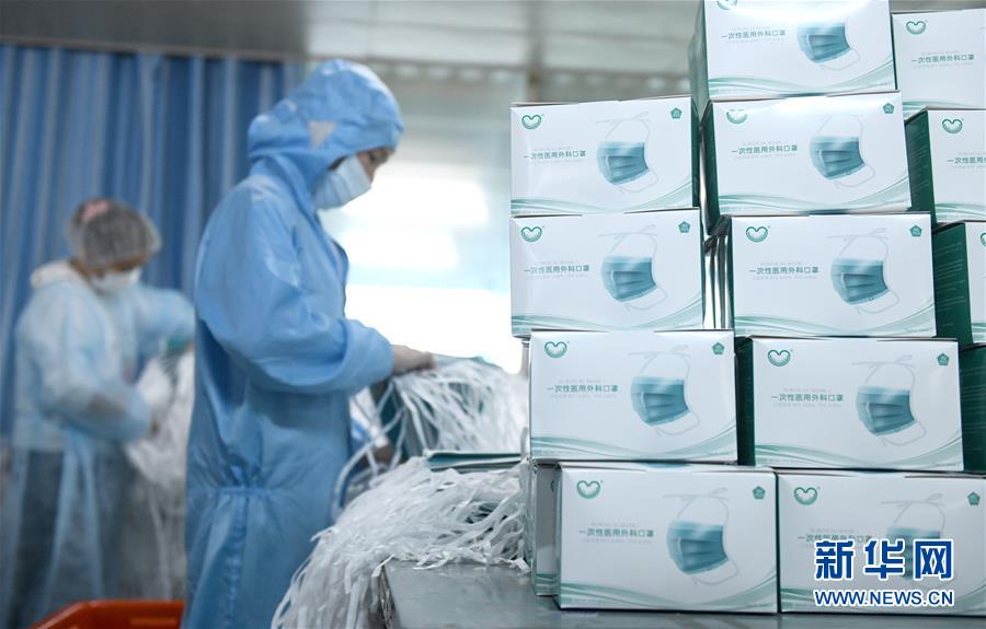 4月7日,工人在生产线上包装口罩。 当日,记者探访位于广州市从化区的口罩生产商广州福泽龙卫生材料有限责任公司。据了解,为保证市场供应,该公司从1月25日开始,就全力以赴投入生产。员工数量从一开始的18人,到现在已经有200多人。产能从最初的每天10万只发展到现在的每天70万只。产品除了被当地政府收储外,也送往湖北抗疫一线,以及北京协和医院、广州市儿童医院等多家医疗机构。从3月20日开始,公司开始接受海外订单。 新华社记者 卢汉欣 摄
