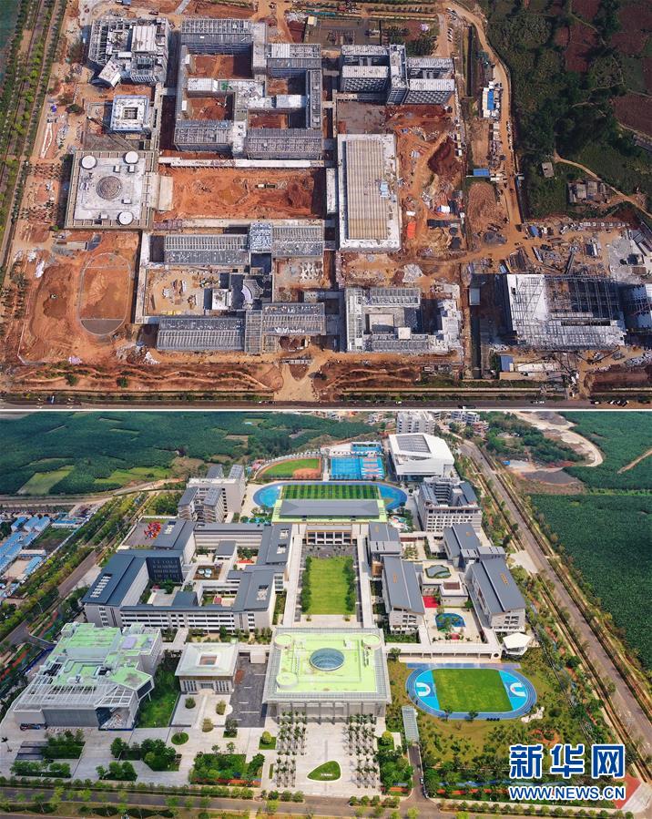 拼版照片:上图为2019年4月10日拍摄的海南生态软件园内的iSchool微城未来学校(无人机照片,新华社记者杨冠宇摄);下图为2020年4月1日拍摄的海南生态软件园内的iSchool微城未来学校(无人机照片,新华社记者郭程摄)。新华社发
