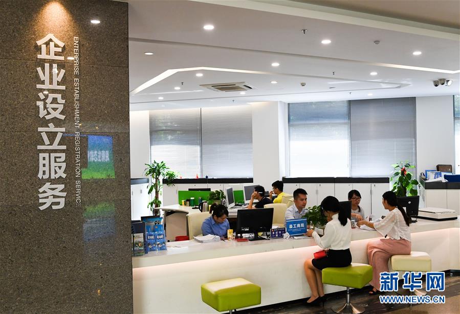 在海南生态软件园的孵化楼内,工作人员在办理业务(2018年5月24日摄)。新华社记者 杨冠宇 摄