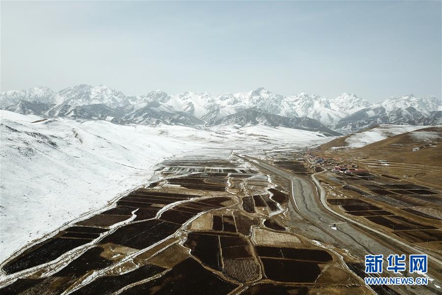 这是4月7日在天祝藏族自治县抓喜秀龙镇境内拍摄的春日雪景(无人机照片)。 近日,地处祁连山东麓的甘肃省武威市天祝藏族自治县境内迎来一场春雪,被白雪覆盖的藏乡犹如一幅静谧的水墨画,分外妖娆。 新华社记者 范培珅 摄