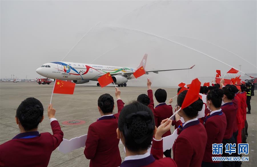 4月7日,在成都双流国际机场,四川最后一批援助湖北医疗队的航班受到“水门”礼迎接。 当日,四川省最后一批援助湖北医疗队队员162人从武汉乘坐飞机回到成都。至此,四川援助湖北医疗队全部平安返回。 新华社记者 王曦 摄