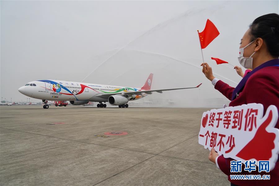 4月7日,在成都双流国际机场,四川最后一批援助湖北医疗队的航班受到“水门”礼迎接。 当日,四川省最后一批援助湖北医疗队队员162人从武汉乘坐飞机回到成都。至此,四川援助湖北医疗队全部平安返回。 新华社记者 王曦 摄
