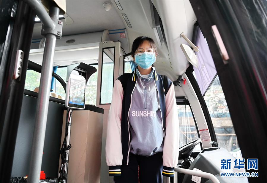 4月7日,福州第三中学的高三年级学生陈银樱从定制公交专线上下车。新华社记者 林善传 摄