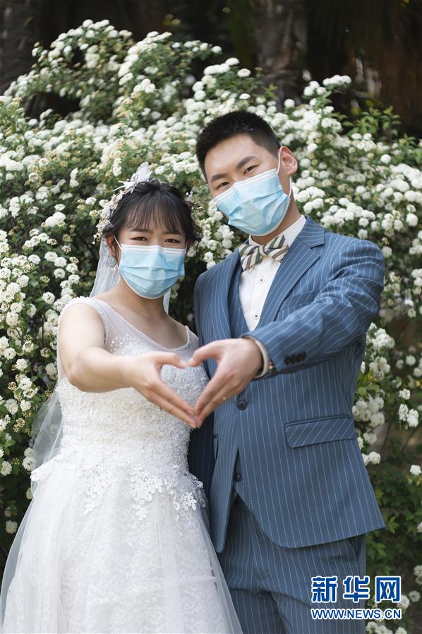 4月7日,在襄阳市老龙堤公园,王堃(右)和袁益风戴口罩拍摄婚纱照。 王堃是湖北省十堰市人,袁益风是湖北省襄阳市人。相恋一年多的两人本打算在2020年2月2日去民政局登记,让这段爱情“修成正果”,没想被疫情打乱了计划。在疫情形势好转,民政局恢复上班后,两人于3月23日登记结婚,并预约在4月7日拍摄婚纱照。 “我们都希望在拍摄婚纱照时能有一组戴口罩的照片,以纪念这段特殊时期中难忘的时光,觉得很有意义”,王堃说。 新华社发(谢剑飞摄)
