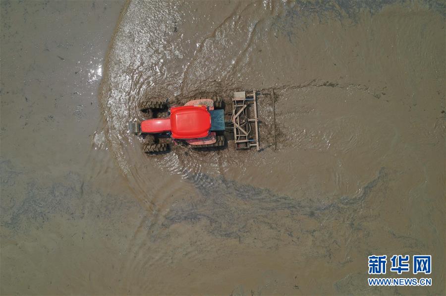 在广西柳州市鹿寨县平山镇石龙村,村民操作机械在刚刚完成“旱改水”改造的土地上忙碌,为即将到来的插秧季做准备(4月7日摄,无人机照片)。 2019年以来,广西柳州市鹿寨县实施耕地提质改造工程,把低产的旱地和荒地改造为水田,带动农业结构调整和优化,增加有效耕地面积,促进土地集约化利用,助力村民脱贫增收。据了解,鹿寨县今年计划完成10000亩“旱改水”任务。 新华社记者 黄孝邦 摄