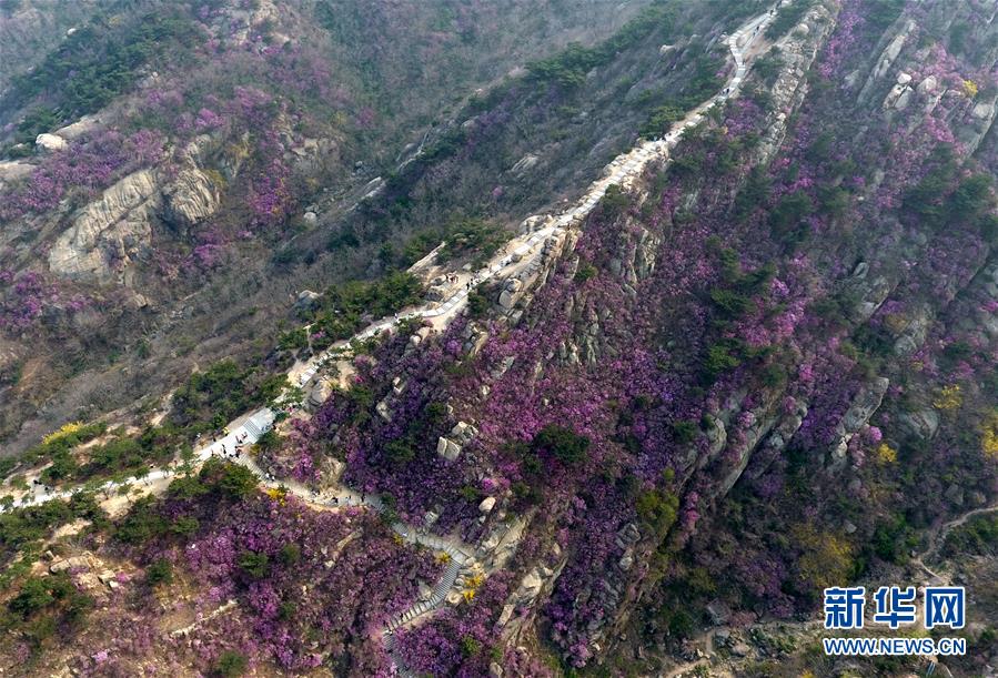 这是4月7日在青岛大珠山拍摄的杜鹃花(无人机照片)。 近日,山东省青岛市大珠山风景区的杜鹃花陆续进入花期,漫山遍野的杜鹃花绵延数里,蔚为壮观。 新华社记者 李紫恒 摄