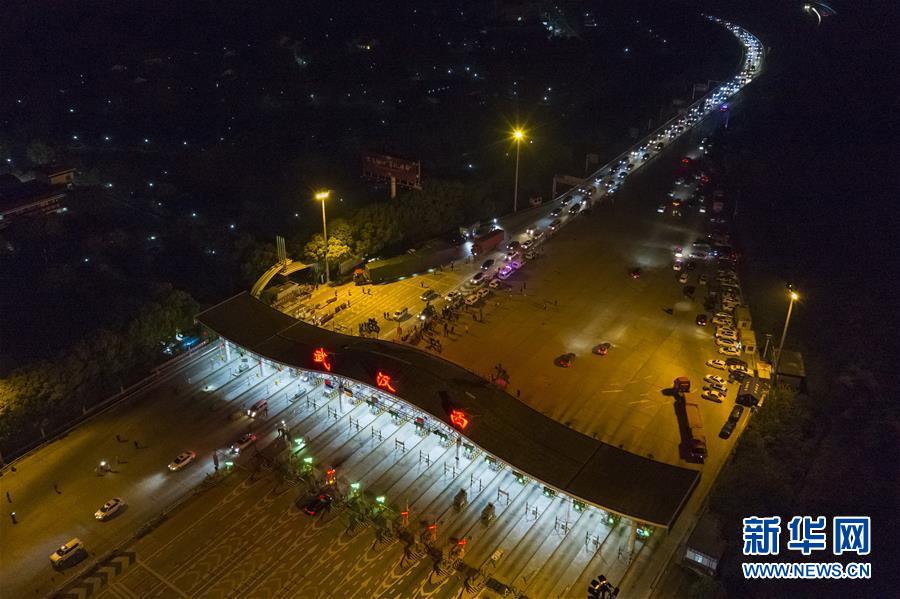 4月8日凌晨,车辆通过武汉西高速收费站(无人机照片)。 新华社记者 沈伯韩 摄