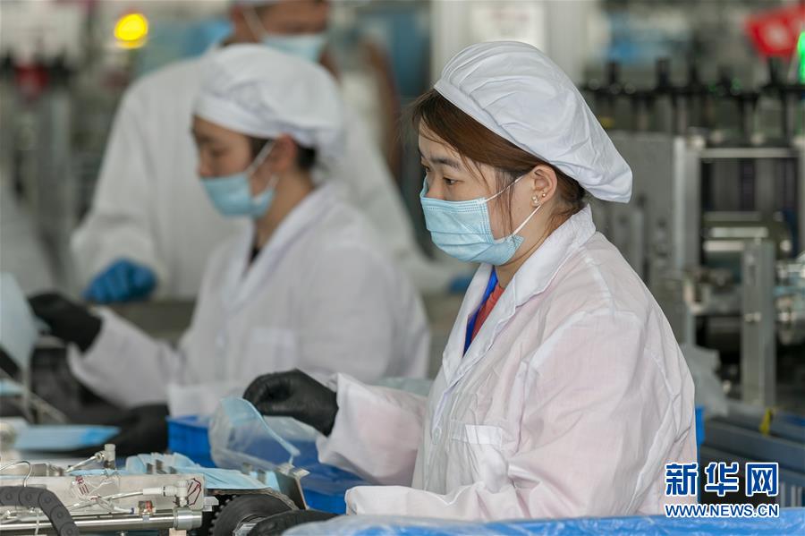 4月8日,在上海市浦东新区三枪工业城口罩生产车间,工作人员在生产口罩。 新华社发(王翔 摄)