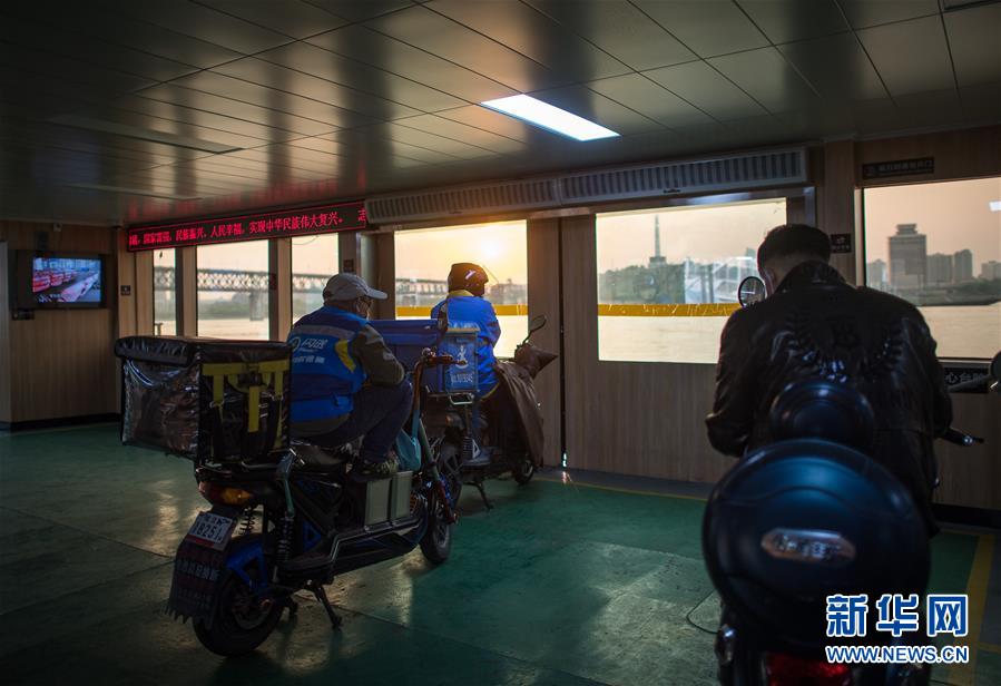 4月8日,乘客乘坐轮渡出行。 4月8日零时起,武汉市解除离汉离鄂通道管控措施。武汉轮渡正式复航,目前武汉长江客运轮渡首先恢复了武中线和零点航班两条市内交通航线。 新华社记者 肖艺九 摄
