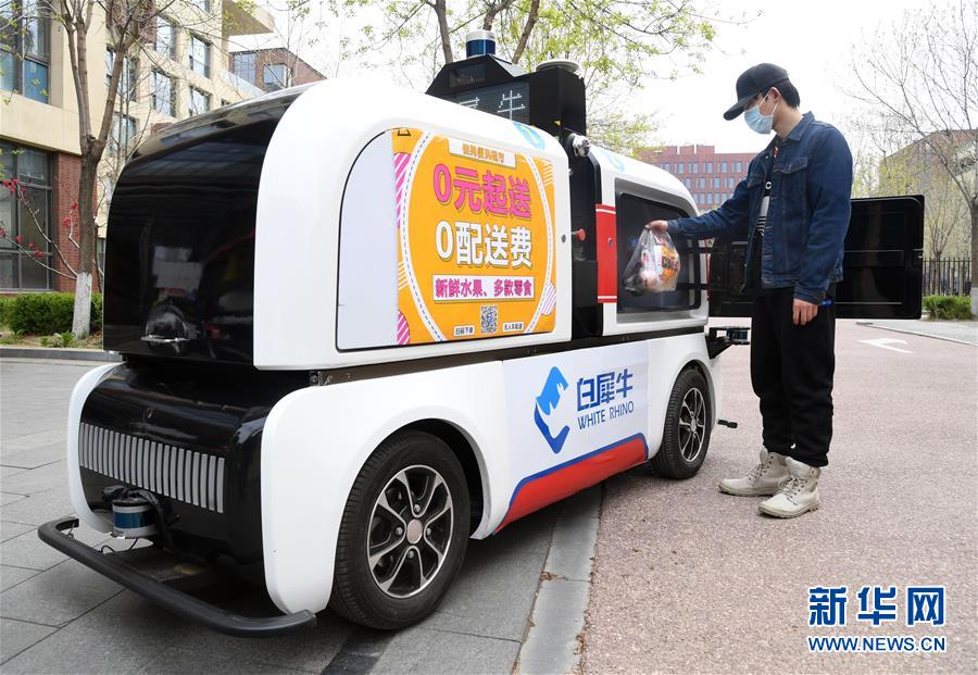 4月9日,在中关村环保科技示范园,园区内企业员工从无人配送车上取出订购的物品。 近期,北京市海淀区中关村环保科技示范园内的企业在做好疫情防控的同时,有序复工复产。 据了解, 园区现有企业70余家,企业员工2万余人。截至4月上旬,园区62家企业陆续复工,复工人数达1.7万余人,企业现场复工率近90%。 新华社记者 任超 摄