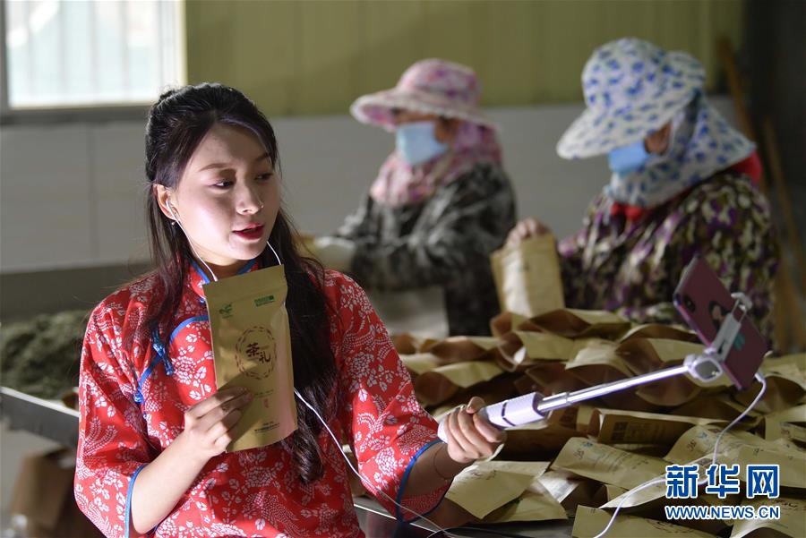 4月8日,鹤峰县鑫农茶业有限公司工作人员田玉妙在包装车间直播。 为促进湖北省鹤峰县40万亩生态茶园的茶叶销售,近日,当地多家茶企积极与电商平台对接,通过直播的方式,向消费者直观呈现茶叶采摘到生产制作的全过程,助力“带茶出山”,帮助茶农脱贫增收。 新华社发(杨顺丕摄)