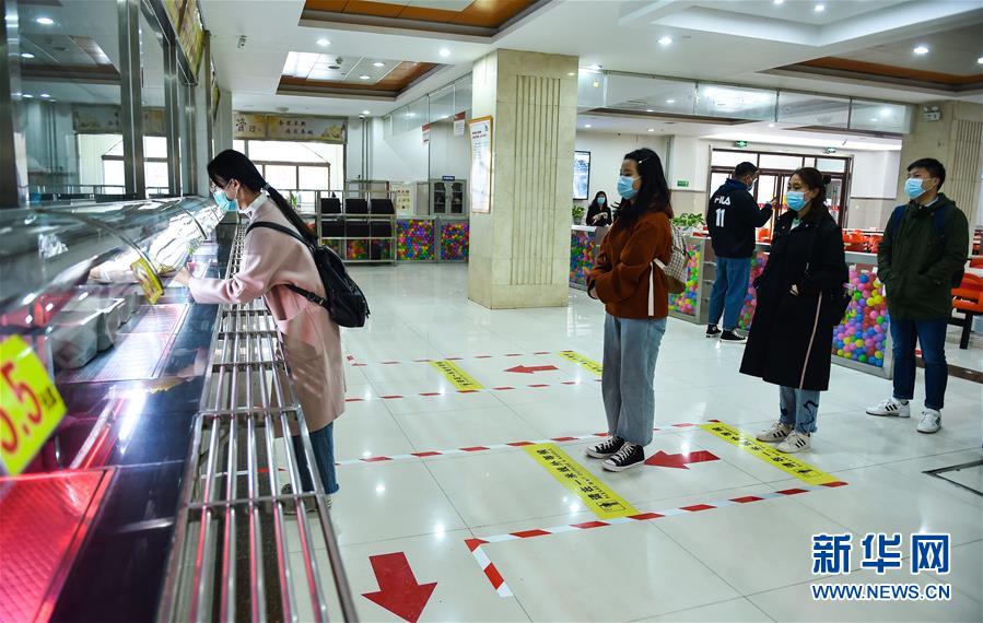 4月9日,在太原理工大学明向校区静雅轩餐厅,提前到校的学生志愿者间隔一米排队就餐。 据山西省教育厅消息,山西省高校本硕博毕业年级将于4月10日起错峰分批开学。山西省各高校全面推进封闭管理、分散住宿、教职工培训、公共场所消杀等各项开学准备工作,保障学生安全复课。 新华社发 (柴婷 摄)