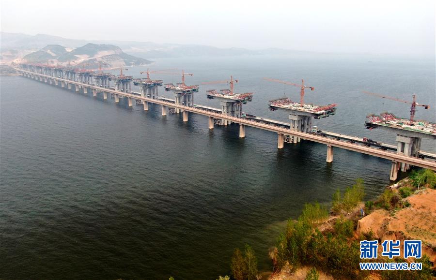 这是4月9日拍摄的渑垣黄河特大桥施工现场(无人机照片)。 目前,渑(河南渑池)垣(山西垣曲)高速公路黄河特大桥工程正加紧建设。该桥是连接晋豫两省的重要省际高速公路通道,设计全长1757米,宽33米,工程计划于2020年底建成通车。 新华社记者 朱祥 摄