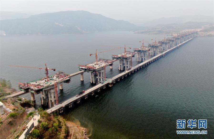 这是4月9日拍摄的渑垣黄河特大桥施工现场(无人机照片)。 目前,渑(河南渑池)垣(山西垣曲)高速公路黄河特大桥工程正加紧建设。该桥是连接晋豫两省的重要省际高速公路通道,设计全长1757米,宽33米,工程计划于2020年底建成通车。 新华社记者 朱祥 摄