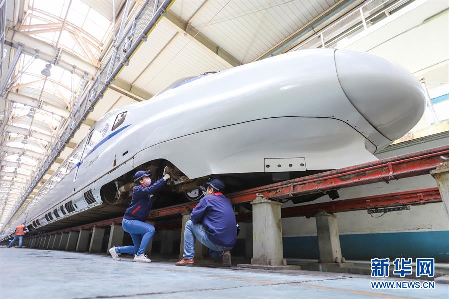 4月9日,在南昌动车运用所,电务部门工作人员王溱鑫(左)正在对列控车载设备走行部进行检修。 4月10日零时起,全国铁路将实施新的列车运行图。 新华社发(鲍赣生 摄)