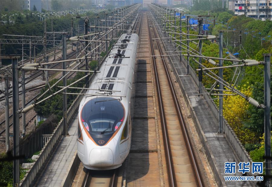 4月9日,一列复兴号动车组列车驶经沪宁城际铁路无锡段。 4月10日零时起,全国铁路将实施新的列车运行图。 新华社发(还月亮 摄)