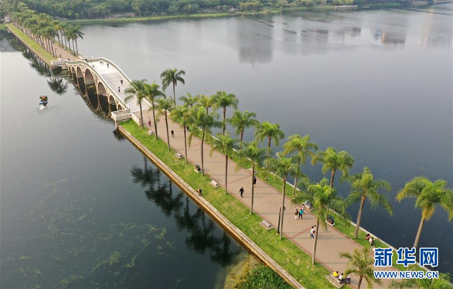 4月9日,市民从广西南宁市南湖一座小桥上走过(无人机照片)。 眼下,素有“绿城”之称的广西南宁市绿意盎然。 新华社记者 陆波岸 摄