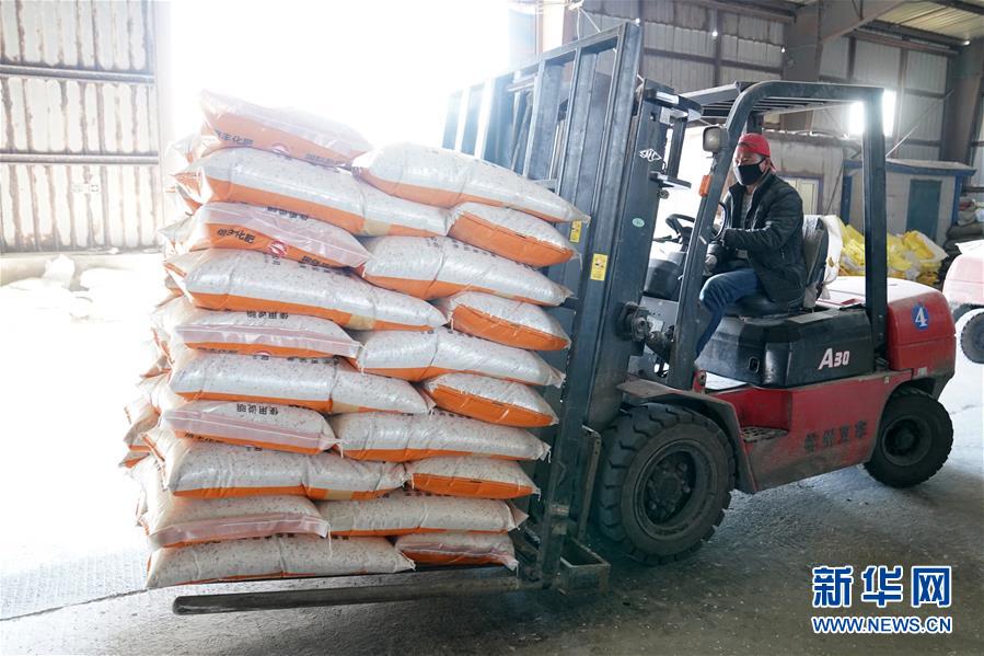 4月9日,工人在龙江县一农资生产企业运输化肥。 近日,黑龙江省产粮大县龙江县积极推进春耕备耕生产,全县初步落实粮食作物种植计划470余万亩。目前龙江县农资生产企业开足马力,保障春耕生产农资需求,全县农机具检修已完成,水稻育秧播种正大范围展开。 新华社记者 王建威 摄