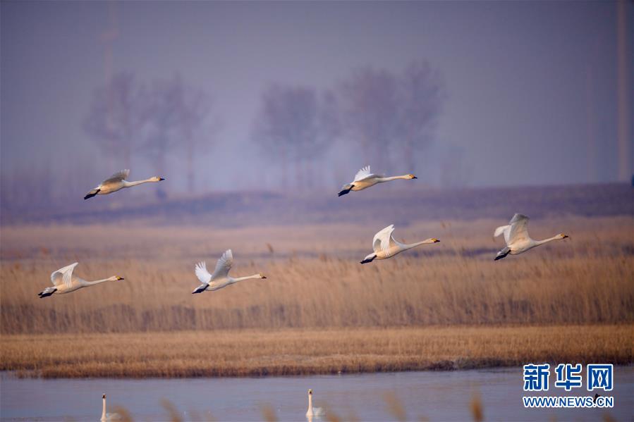 4月9日,在位于吉林省白城市镇赉县的莫莫格国家级自然保护区,天鹅从湿地上空飞过。 随着气温回暖,位于吉林省白城市镇赉县境内的莫莫格国家级自然保护区迎来候鸟北归高峰期。近两千只白鹤,数万只大雁、野鸭等在此停歇休养,补给觅食。 新华社记者 张楠 摄