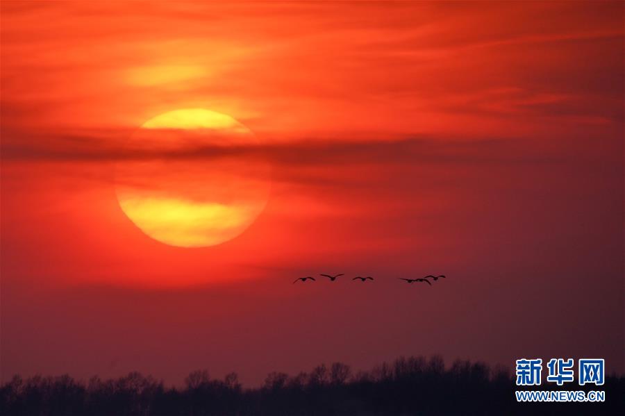 4月9日,在位于吉林省白城市镇赉县的莫莫格国家级自然保护区,候鸟从湿地上空飞过。 随着气温回暖,位于吉林省白城市镇赉县境内的莫莫格国家级自然保护区迎来候鸟北归高峰期。近两千只白鹤,数万只大雁、野鸭等在此停歇休养,补给觅食。 新华社记者 张楠 摄
