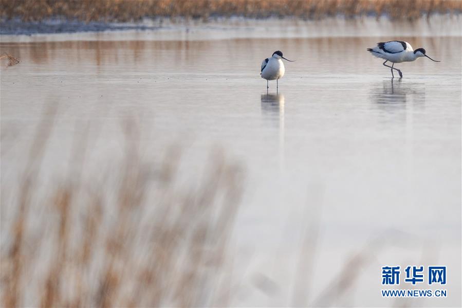4月9日,在位于吉林省白城市镇赉县的莫莫格国家级自然保护区,两只反嘴鹬在湿地觅食。 随着气温回暖,位于吉林省白城市镇赉县境内的莫莫格国家级自然保护区迎来候鸟北归高峰期。近两千只白鹤,数万只大雁、野鸭等在此停歇休养,补给觅食。 新华社记者 张楠 摄