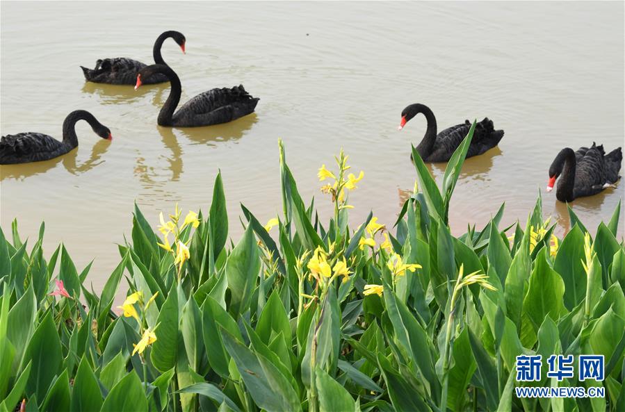 这是4月9日在南宁园博园拍摄的黑天鹅。 春日时节,广西南宁园博园风光旖旎,生机勃勃。 新华社记者 周华 摄