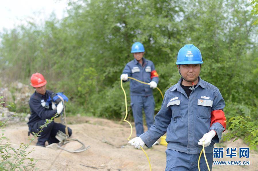 4月9日,在贵州省湄潭县工业园区,遵义湄潭供电局员工在帮助一家汽车维修企业架设线路。 3月份以来,贵州电网公司遵义湄潭供电局在做好疫情防控工作的同时,组织多支党员突击队,为复工复产企业上门服务,解决企业安全用电问题。 新华社记者 杨楹 摄